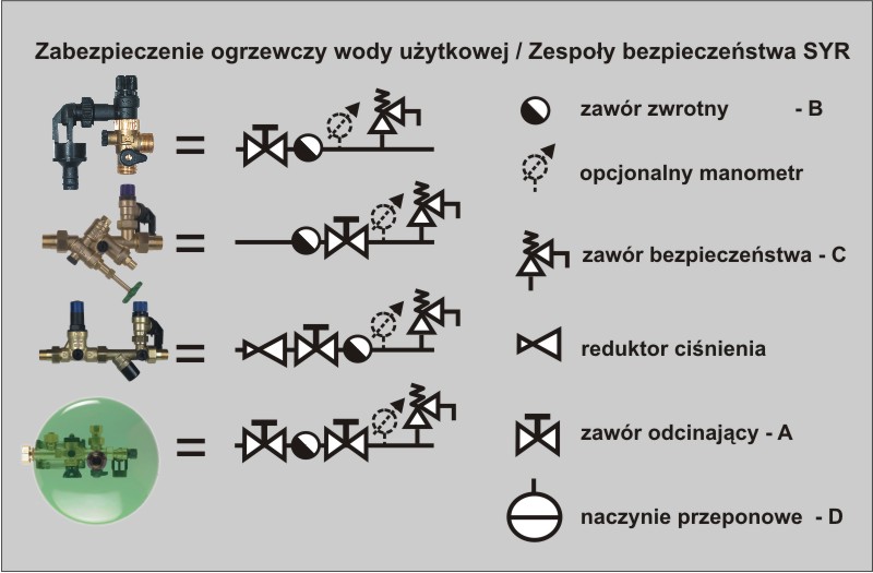 Urządzenia grzewcze, ciśnieniowe jak i podgrzewacze wody powinny być wyposażone w zawory bezpieczeństwa SYR 1915 lub 2115. Związane jest to ze wzrostem objętości podgrzewanej w tym urządzeniu cieczy (np. wody).