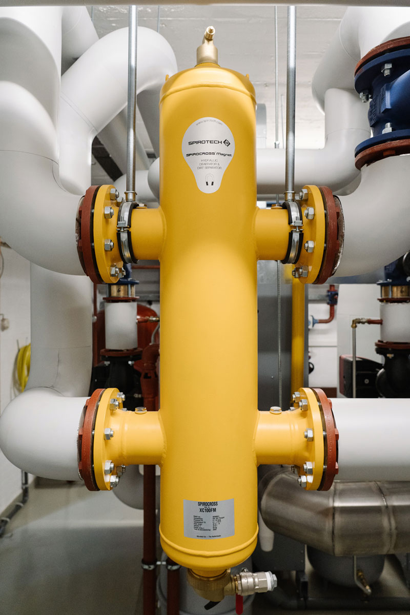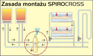 SPIROCROSS MAGNET to urządzenie łączące funkcje trzech różnych urządzeń w jednym. Na pierwszy rzut oka jest to sprzęgło hydrauliczne (kolumna mieszająca, zwrotnica hydrauliczna), którego zadaniem jest wyrównanie różnic przepływu objętościowego pomiędzy zasilaniem i odbiorem. Za jego pomocą rozdzielamy obieg kotłowy od obiegów grzewczych, co jest szczególnie ważne dla dużych instalacji o dużych mocach. Dzięki takiemu rozwiązaniu ułatwiamy regulację (równoważenie) i sterowanie instalacji. W przypadku SPIROCROSS MAGNET zastosowano w jego wnętrzu wiązkę rur SPIRO. To pozwoliło na uzyskanie dwóch dodatkowych funkcji! Rura SPIRO wychwytuje zarówno wolne powietrze, mikropęcherze powietrza jak i zanieczyszczenia od 0,5 μm wzwyż. Wyłapane mikropęcherze unoszą się do komory odpowietrznika, skąd następnie usuwane są przez wysokiej jakości odpowietrznik automatyczny. Wszystkie zanieczyszczenia natomiast opadają do komory kolekcyjnej. Co pewien czas należy ją opróżnić poprzez zawór odszlamiający.