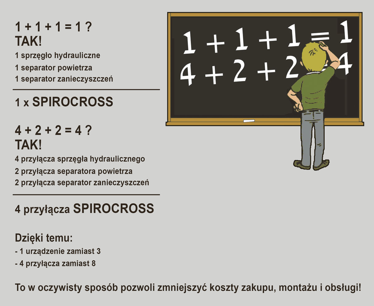 Co ważne, procesy odpowietrzania instalacji i usuwania zanieczyszczeń odbywają się w sposób ciągły, bez przerywania pracy całego układu grzewczego/chłodniczego, przy minimalnych oporach przepływu! Dzięki takiemu rozwiązaniu zwiększamy wydajność systemu przy jednoczesnej minimalizacji wystąpienia usterek. Ponadto połączenie trzech urządzeń w jednym wymaga mniej miejsca przeznaczonego do montażu. Wszystko to skutkuje obniżeniem kosztów zakupu, montażu i obsługi.