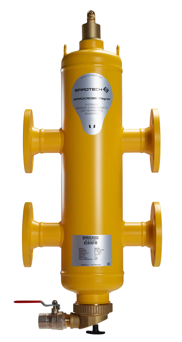 Separator powietrza i zanieczyszczeń z funkcją sprzęgła hydraulicznego SPIROCROSS MAGNET stalowy. Jest to urządzenie bezobsługowe, pracujące bez siatek i filtrów, zapewniające ciągłą separację powietrza (gazów) i zanieczyszczeń stałych do najdrobniejszych cząstek, utrzymując instalację w stanie uzdatnienia oraz pozwalające zrównoważyć hydraulicznie instalację. Wykonanie ze stali na rurociągi DN50-DN300, połączenia kołnierzowe.