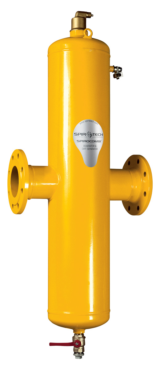 Separator powietrza i zanieczyszczeń SPIROCOMBI stalowy Hi-flow. Jest to urządzenie bezobsługowe, pracujące bez siatek i filtrów, zapewniające ciągłą separację powietrza (i gazów) oraz zanieczyszczeń stałych do najdrobniejszych cząstek, utrzymując instalację w stanie uzdatnienia. SPIROCOMBI wykonywany jest w wersji Hi-flow głównie dla instalacji chłodniczych – duże przepływy czynnika – większe niż w instalacjach ciepłowniczych. Wykonanie ze stali na rurociągi poziome DN50-DN300, połączenia kołnierzowe lub do wspawania.