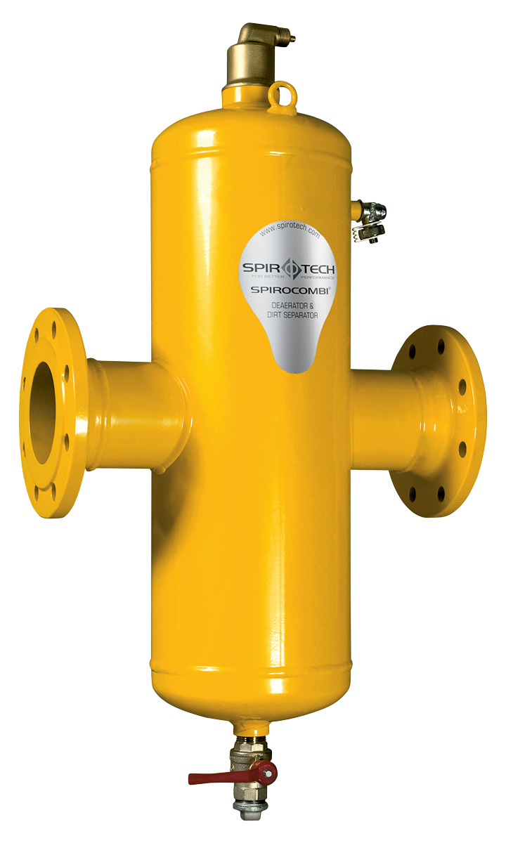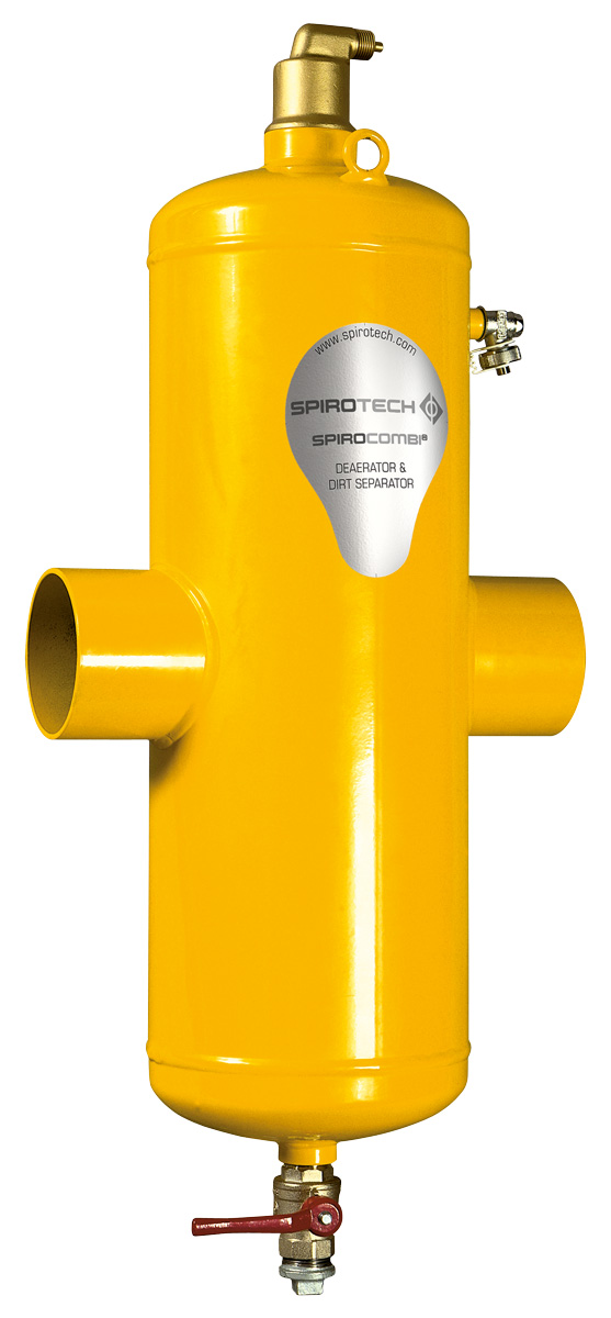 Separator powietrza i zanieczyszczeń SPIROCOMBI. Jest to urządzenie bezobsługowe, pracujące bez siatek i filtrów, zapewniające ciągłą separację powietrza (i gazów) oraz zanieczyszczeń stałych do najdrobniejszych cząstek, utrzymując instalację w stanie uzdatnienia. Wykonanie ze stali na rurociągi poziome DN50-DN300, połączenia kołnierzowe lub do wspawania. Separatory powietrza i zanieczyszczeń SPIROCOMBI mogą być stosowane w instalacji wypełnionej mieszaniną wody z glikolem. Maksymalna zawartość glikolu nie może przekraczać 50%.