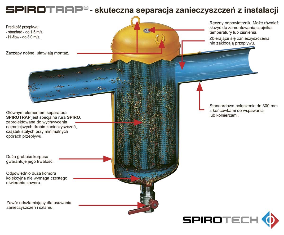 Separator zanieczyszczeń SPIROTRAP stalowy Hi-flow, rozbieralny. Jest to urządzenie bezobsługowe, pracujące bez siatek i filtrów, zapewniające ciągłą separację zanieczyszczeń stałych do najdrobniejszych cząstek, utrzymując instalację w stanie uzdatnienia – wolną od zanieczyszczeń. SPIROTRAP wykonywany jest w wersji Hi-flow głównie dla instalacji chłodniczych – duże przepływy czynnika – większe niż w instalacjach ciepłowniczych. Wykonanie ze stali na rurociągi poziome DN50-DN300, połączenia kołnierzowe lub do wspawania – wersja rozbieralna (możliwość wyjęcia siatek – rur SPIRO).